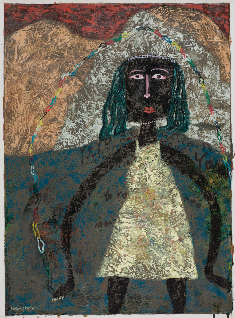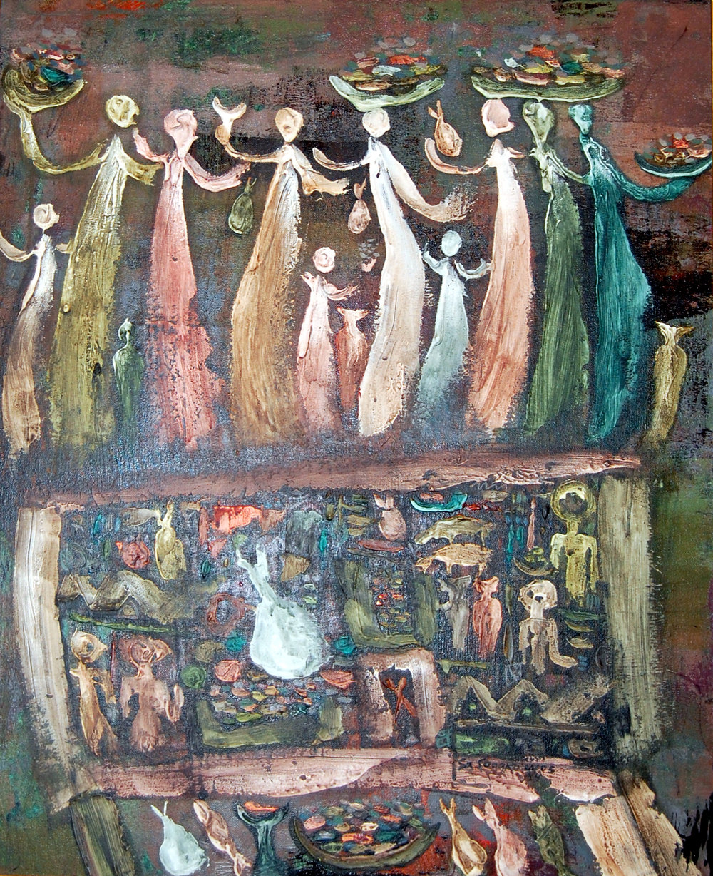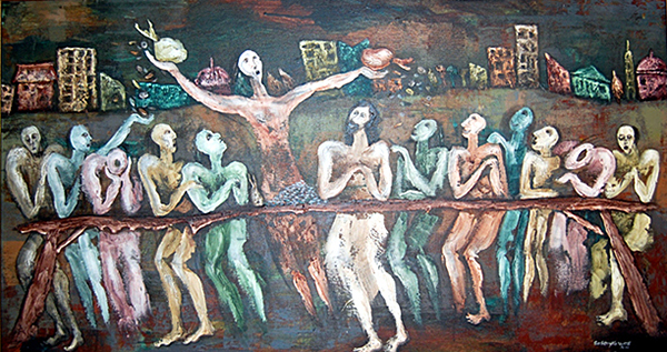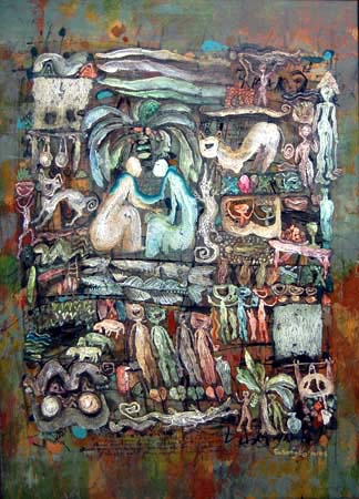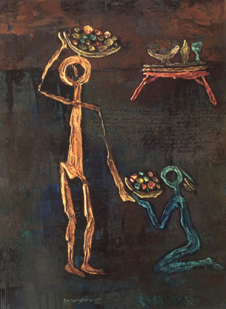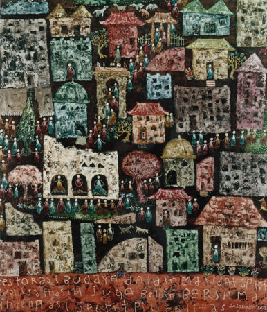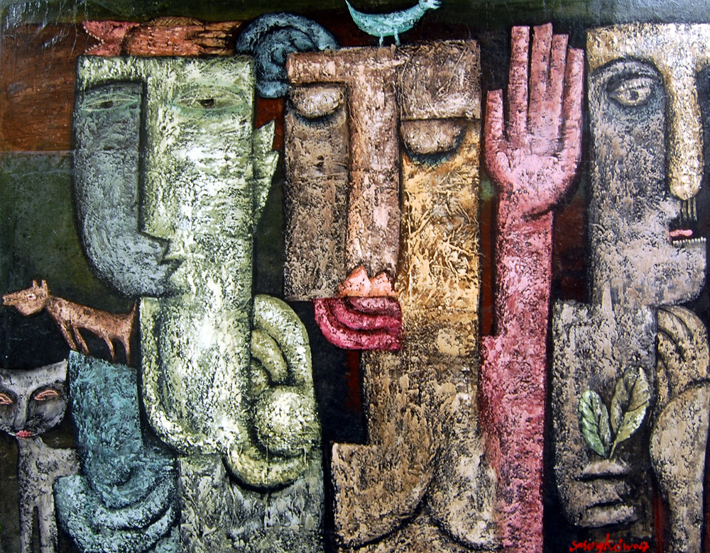 Sasongko differs somewhat from many other Asian Christian artists in that he rarely depicts biblical events or stories, placing more emphasis on precepts of the Kingdom of God, or infusing his work with redemptive content or Christian themes. His concerns have more to do with “…how Christian people apply love and ceremony to transform this culture.”